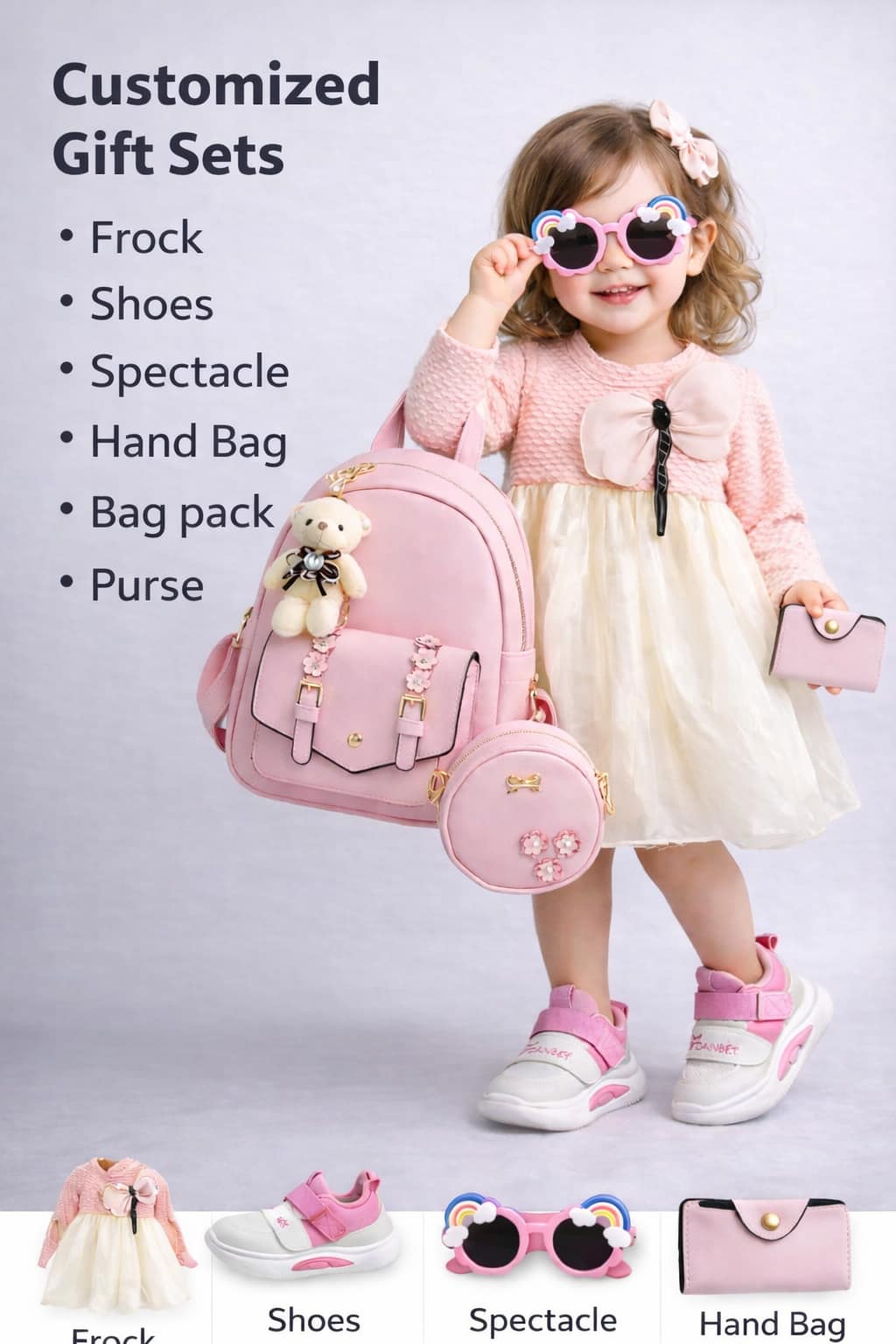 A beautifully arranged giftset Party Wear Frock,Spectacles,Hand bag, Bag Pack,Shoes, Small Purse.