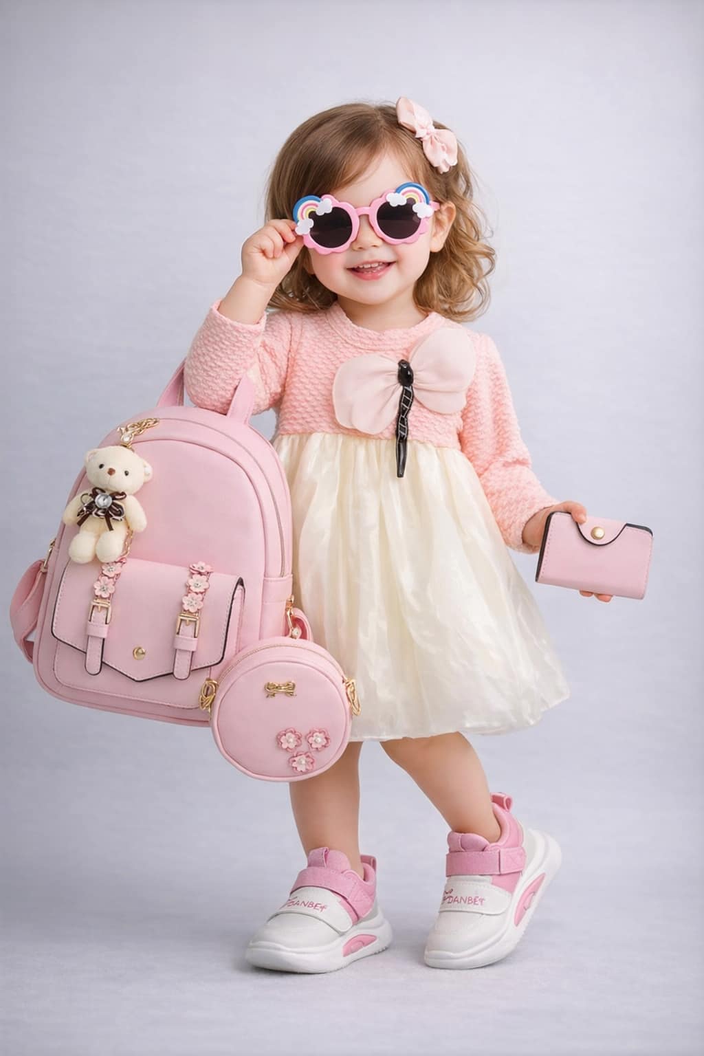 Party Wear Frock,Spectacles,Hand bag, Bag Pack,Shoes, Small Purse