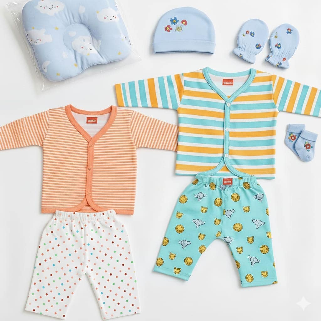 Package Included : Baby Vest With Long Pant 2pcs,Caps,Mittens,Booties,Pillow.